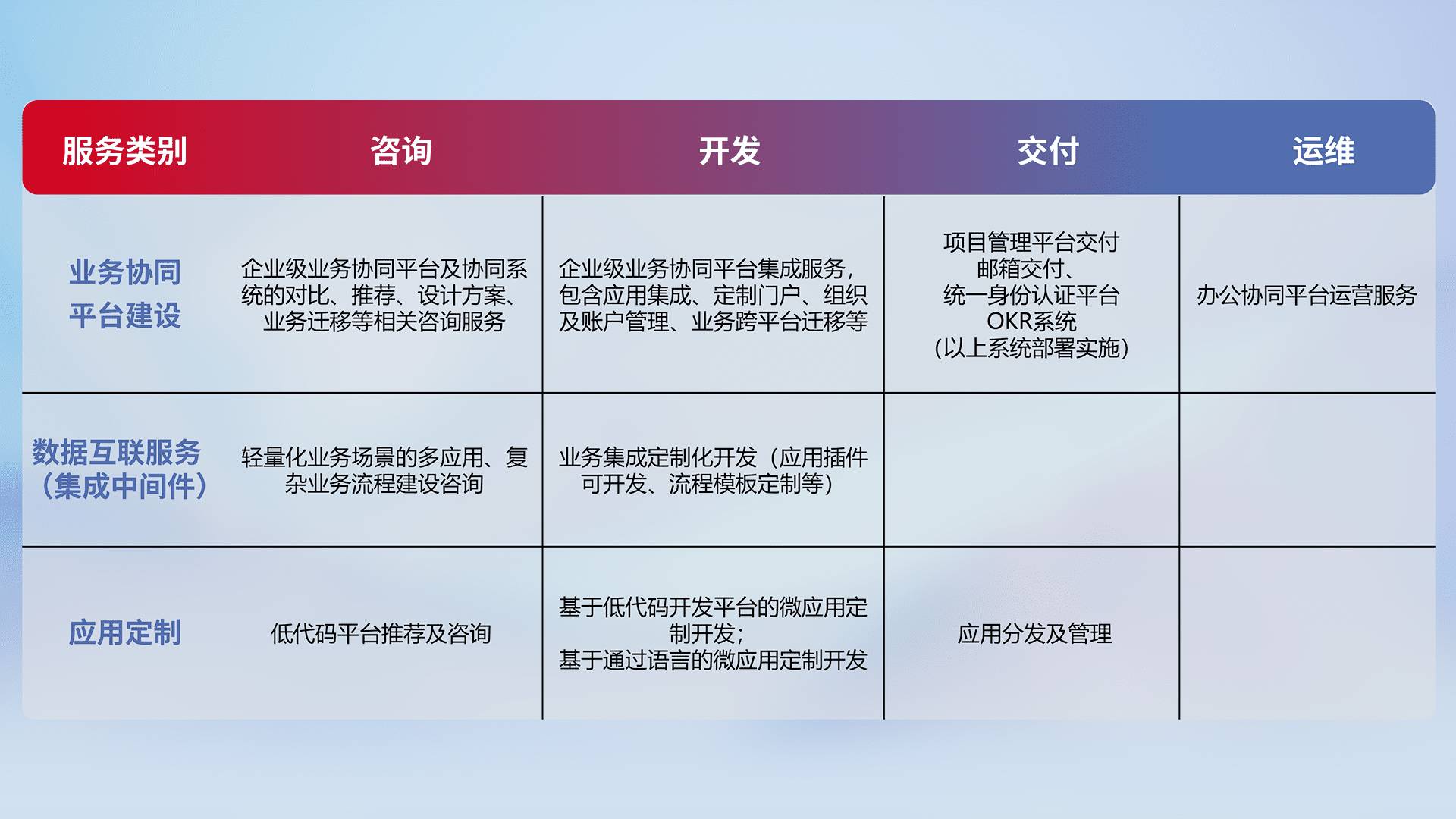 针对钉钉、、、、企微、、IDaas等平台级产品提供产品的规划、、方案、、、、交付、、、定制化开发等服务,,实现如统一协同办公、、、智能客户服务、、、、混合会议管理、、、、智能数据查询、、、、等业务场景,,,,实现数字化转型。。。。