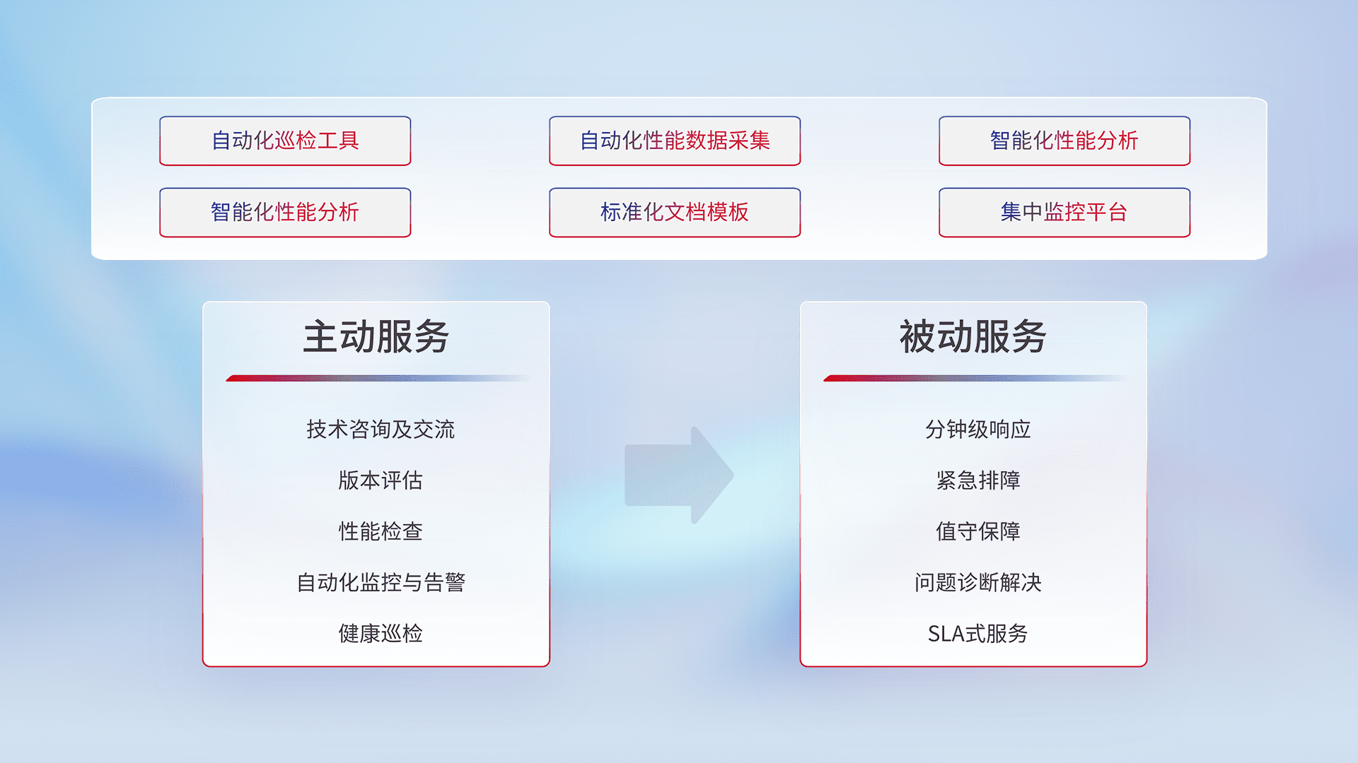 智能化工具和标准化文档,,保障服务质量,,提供主动服务(包含技术咨询、、版本评估、、、性能检查、、、、自动化监控与告警、、健康巡检)和被动服务包含(分钟级响应、、、紧急排障、、、、值守保障、、问题诊断解决、、、、SLA服务)。。